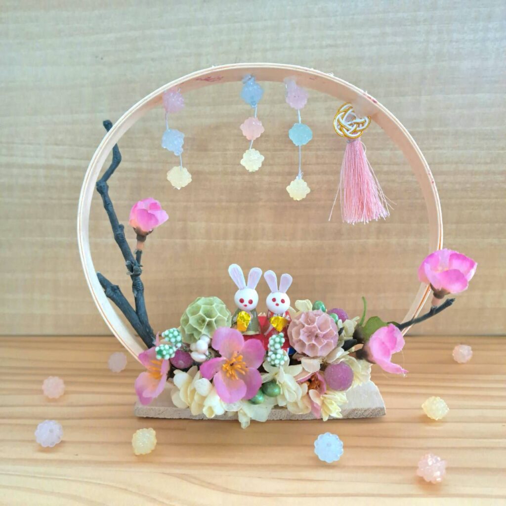 かわいいうさぎのひな祭りデザインです。うさぎの雛人形や金平糖のすだれ、ブリザーブドフラワーをお好みでお選びいただき楽しく飾りつけていきましょう♪