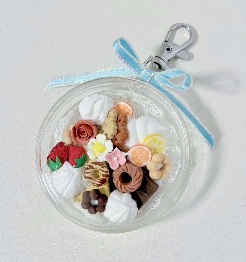 手づくりのお花やお菓子パーツをぎゅっと詰め込んで、世界にひとつだけのオリジナルキーホルダーを作りましょう。