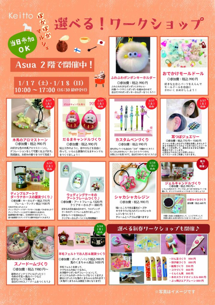 新登場のふわふわぽんぽんや新春ワークショップ、ぽかぽかカイロなど、人気のワークショップが10種類以上集結します!