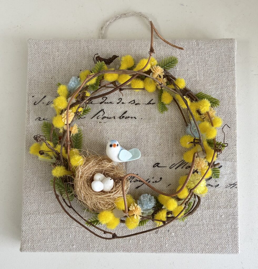 アーティフィシャルフラワーのミモザと、作家さん手づくりの小鳥や巣のパーツを組み合わせて、この季節にぴったりのミニリースを作成します。
