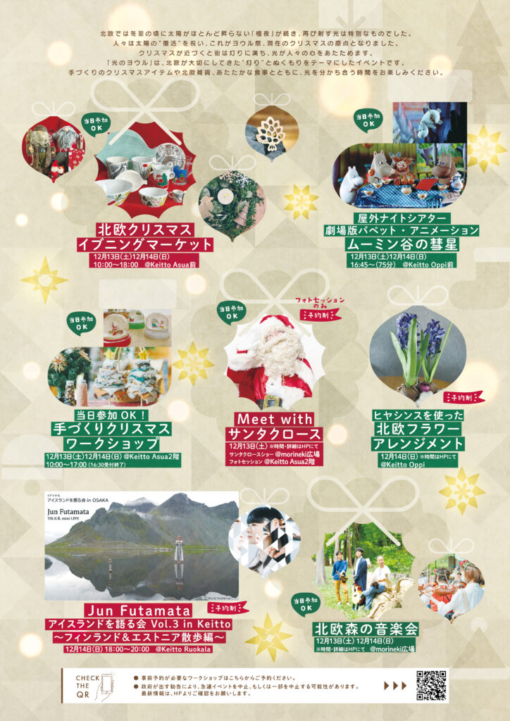 自分でつくるクリスマスアイテム、北欧雑貨のお買い物やあたたかなお食事を楽しみながら、光を分かち合うひとときを、ごゆっくりお過ごしください。