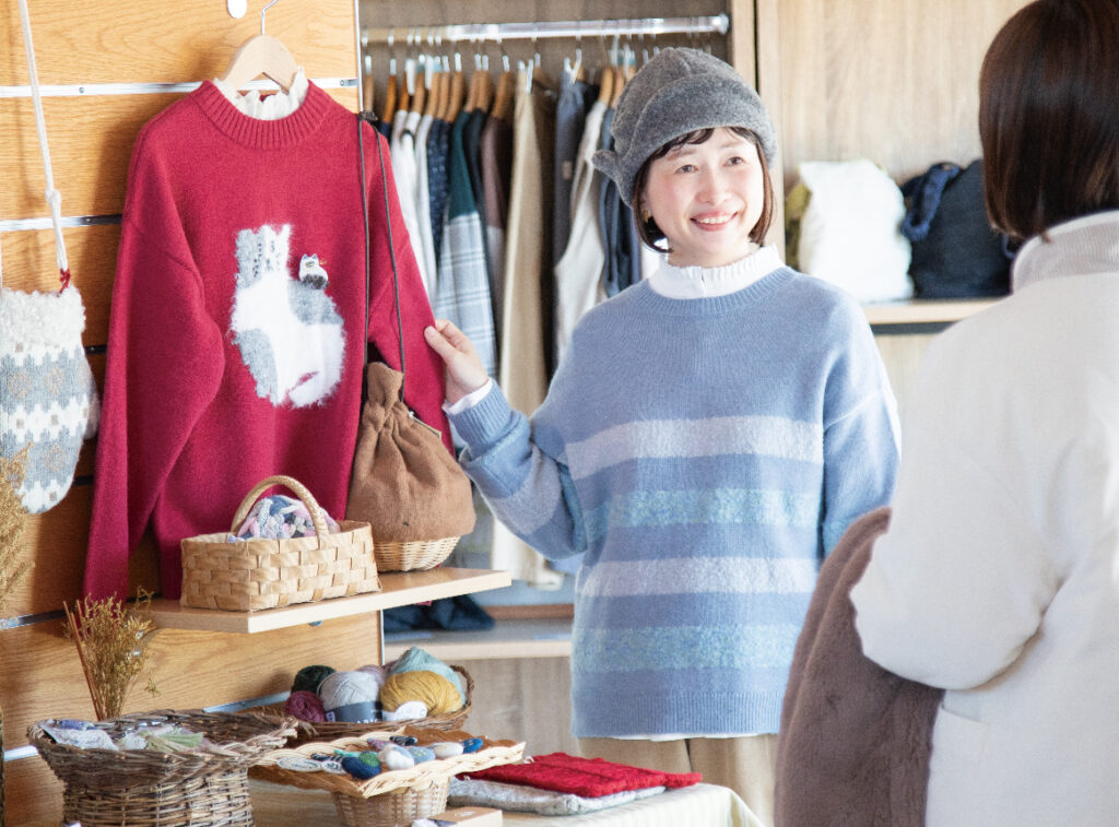 「ちいさなLYKKEの装い展」には、Keittoのハギレやボタンを使った小物や北欧の蚤の市の品が並び、ちいさな幸せが集まる空間に。ゆみこさんも店頭に立ち、お客さまとも心が通う時間を過ごします。打ち合わせから携わった装い展を通じて、学んだことが多く、作家としてのものづくりを改めて考える機会にもなりました。