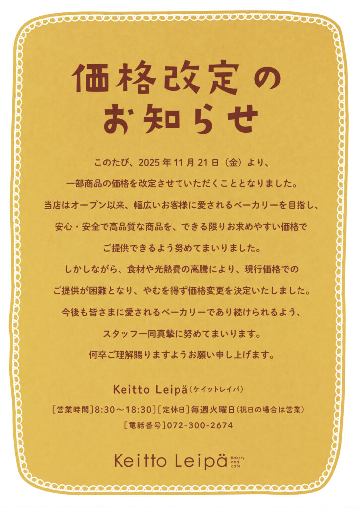 このたび2025年11月21日(金)より、パンの販売価格を改定することとなりました。