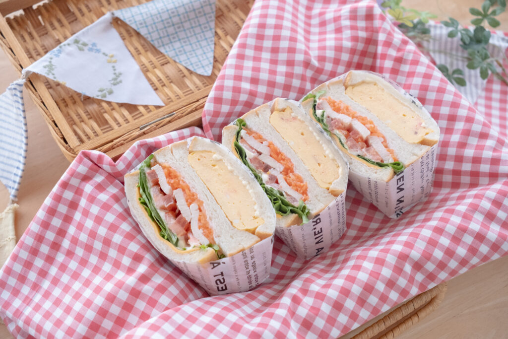 桜えびを混ぜ込んだ風味豊かなだし巻き玉子に、彩り豊かな野菜とチキンを合わせてサンドしました。
