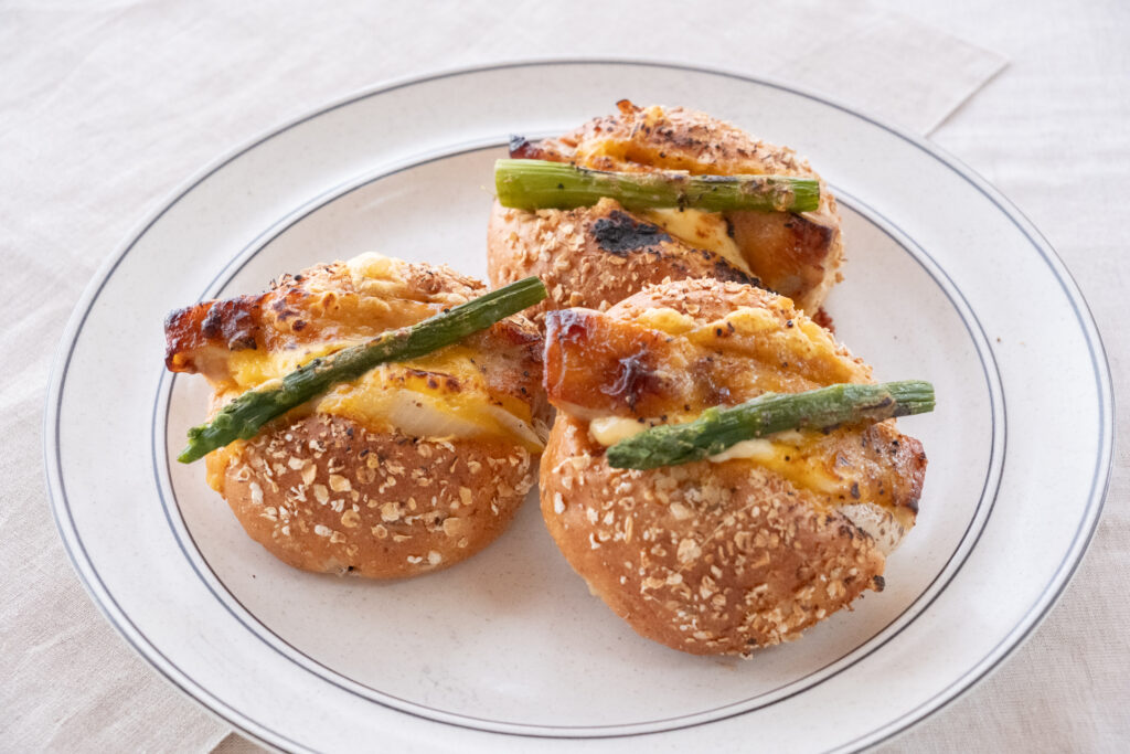五穀北条パンに、旬のアスパラと甘みのある新玉ねぎ、香ばしい照り焼きチキンをサンドしました。