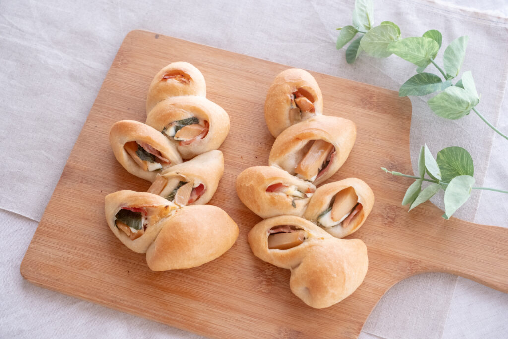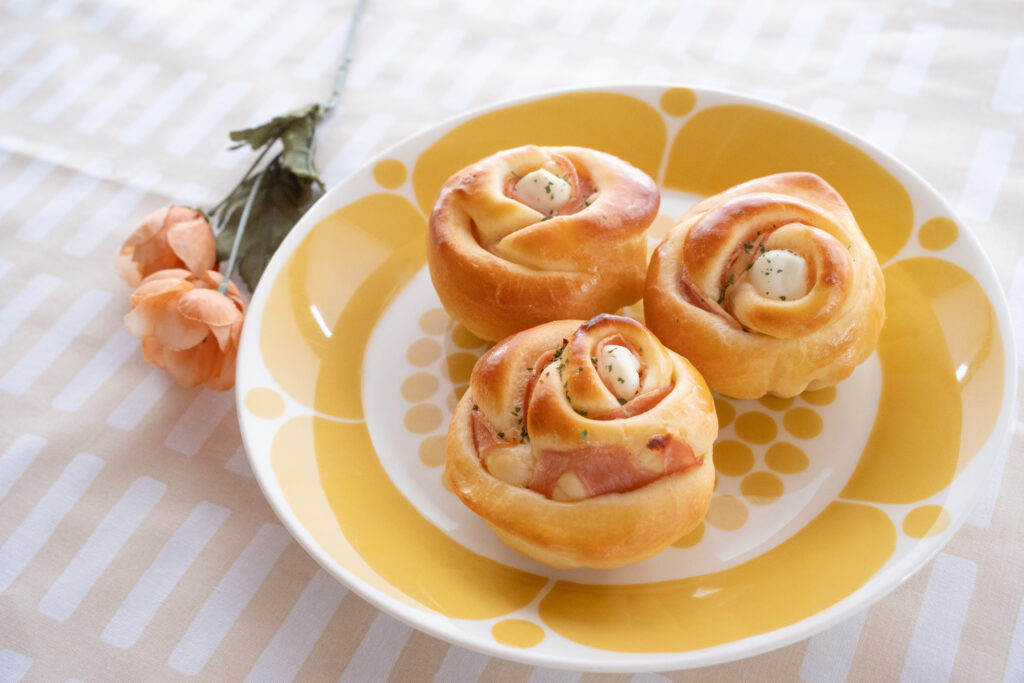 ハムとチーズをやさしく巻き込み、お花の形にかわいらしく仕上げました。