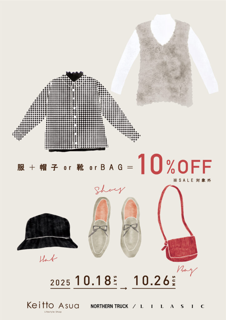 対象のお洋服・靴・帽子・BAGのいずれかをセットでご購入いただくと、レジにて10%OFFに!