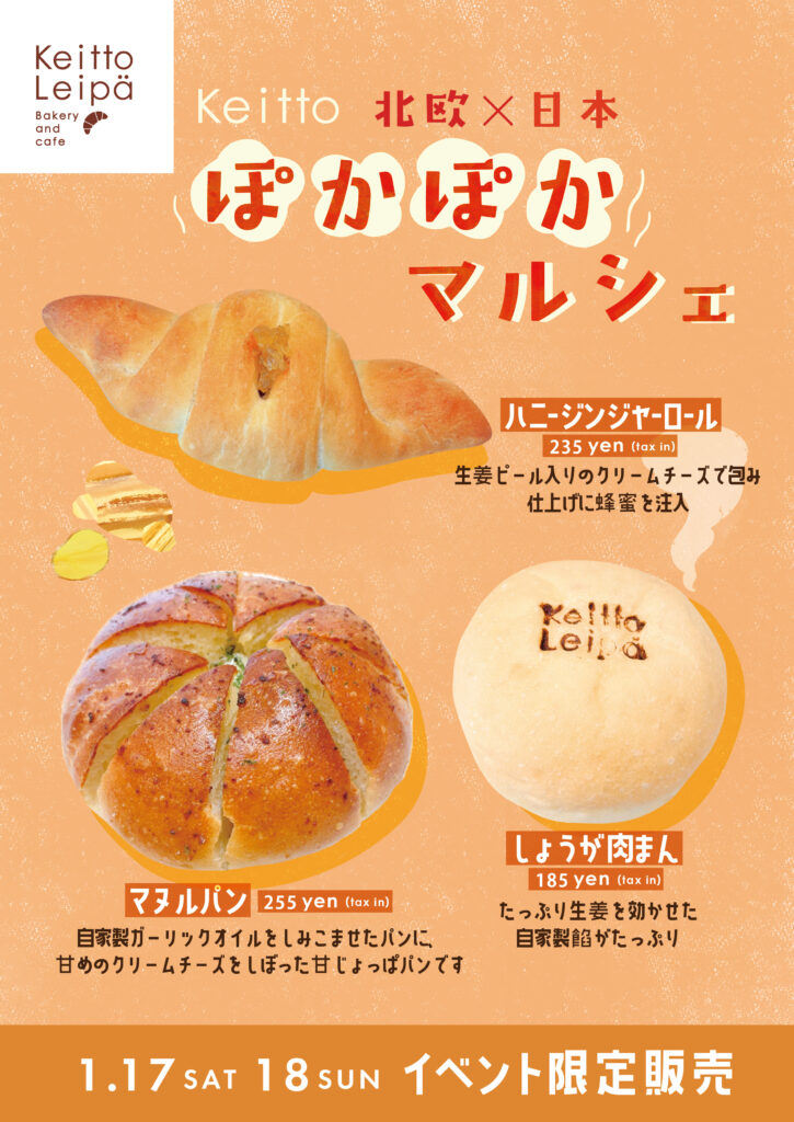 北欧×日本 ぽかぽかマルシェでは、たっぷり生姜を効かせた自家製餡を包んだしょうが肉まん、生姜ピール入りのクリームチーズを包み仕上げに蜂蜜を注入したハニージンジャーロール、そして自家製ガーリックオイルをしみこませたパンに甘めのクリームチーズをしぼった、甘じょっぱいマヌルパンの3種類の限定パンをご用意しています。