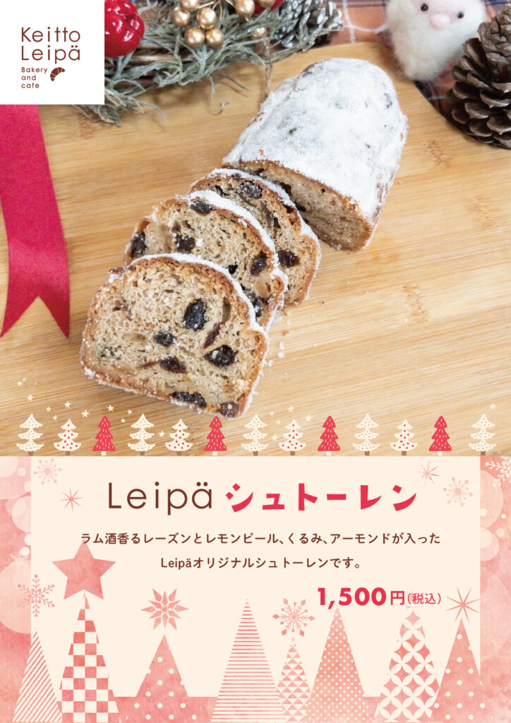 ラム酒がほんのりと香るジューシーなレーズンをはじめ、爽やかな酸味がアクセントになるレモンピール、そして香ばしいくるみとアーモンドを贅沢に練り込んだ Leipaオリジナルのシュトーレン です。