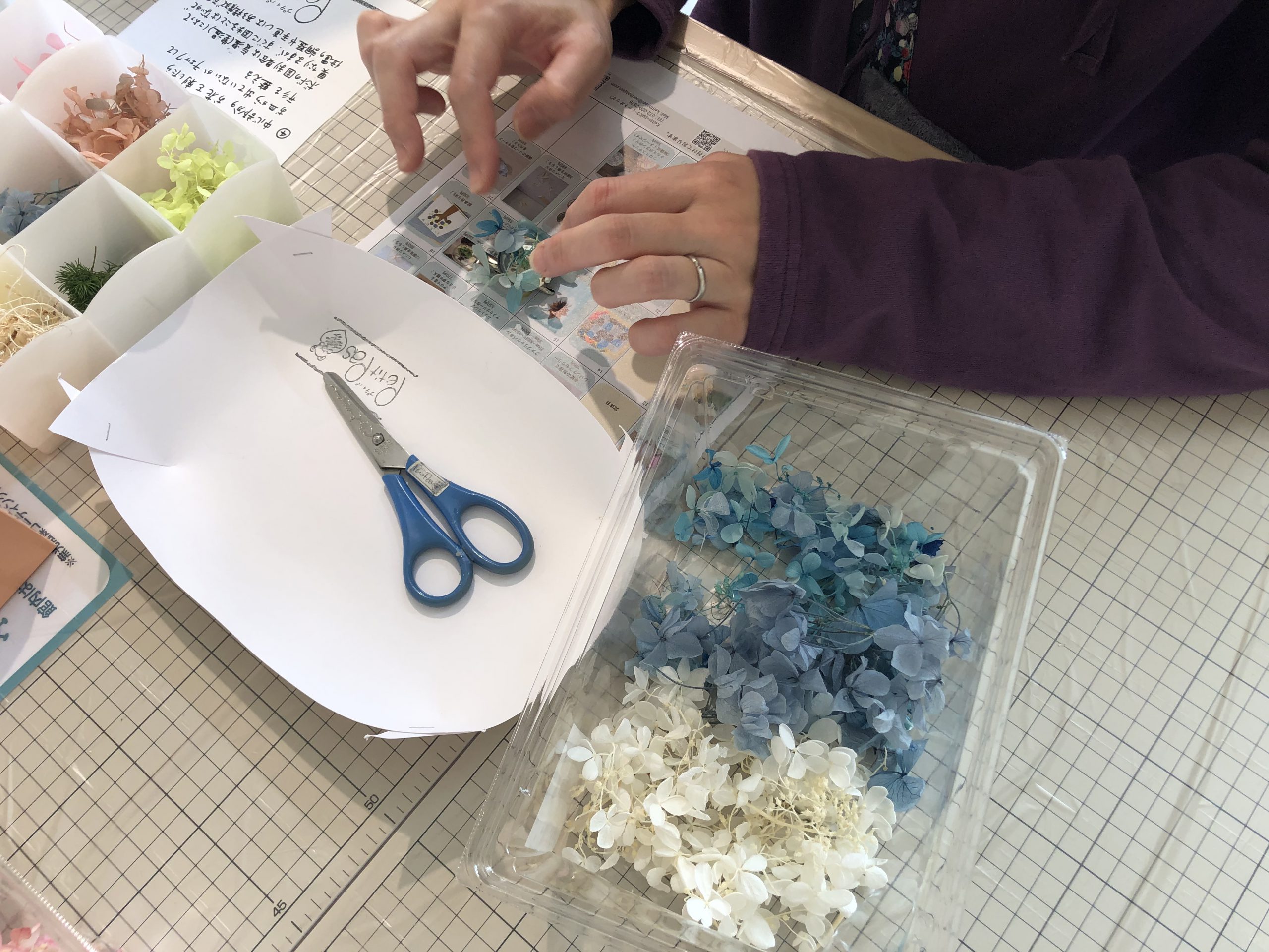 その日のワークショップは、ブリザーブドフラワーを使ったコサージュづくり。