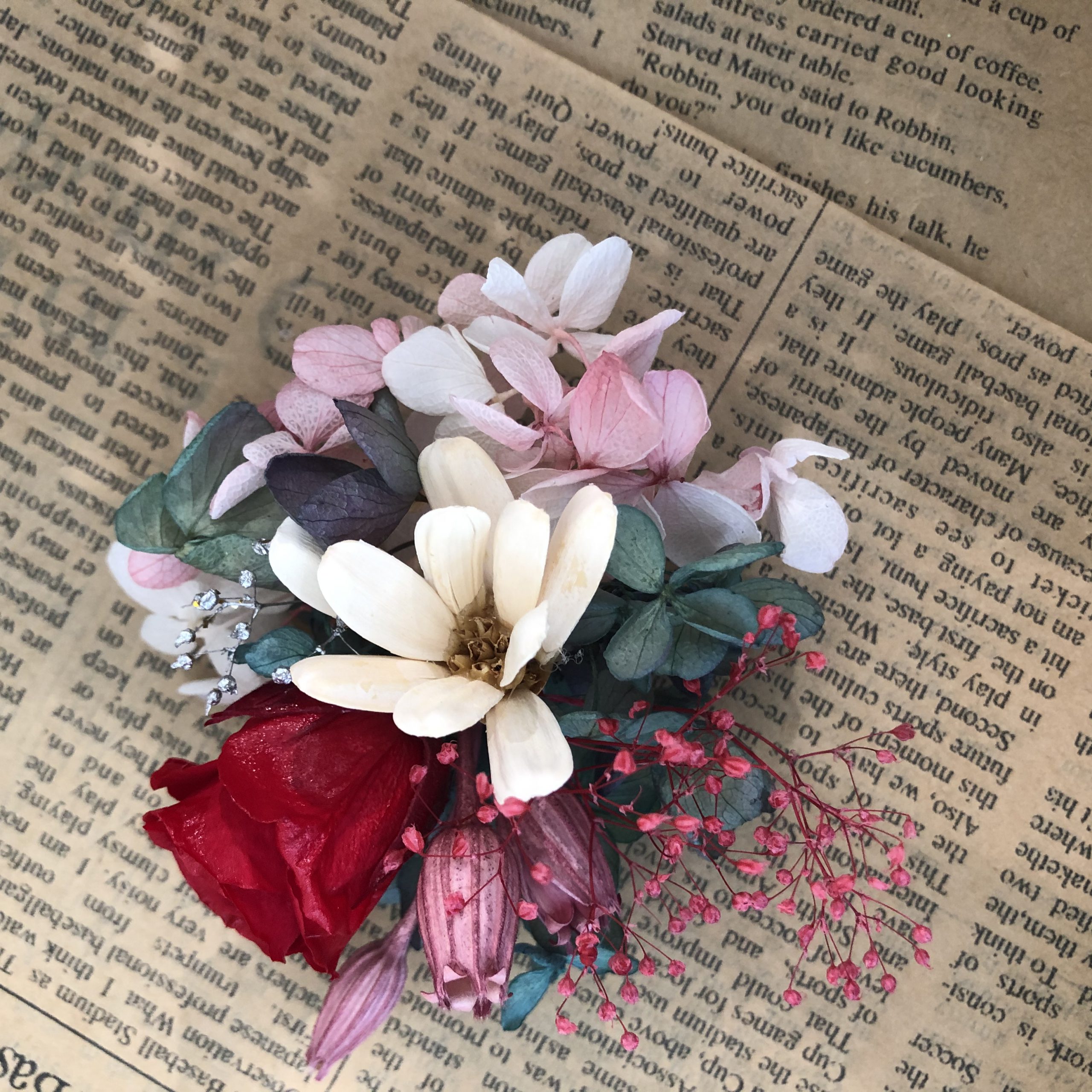 同じ素材のお花を使っても、色の選択や配置の違いで、まったく違う印象の個性豊かなコサージュができます。