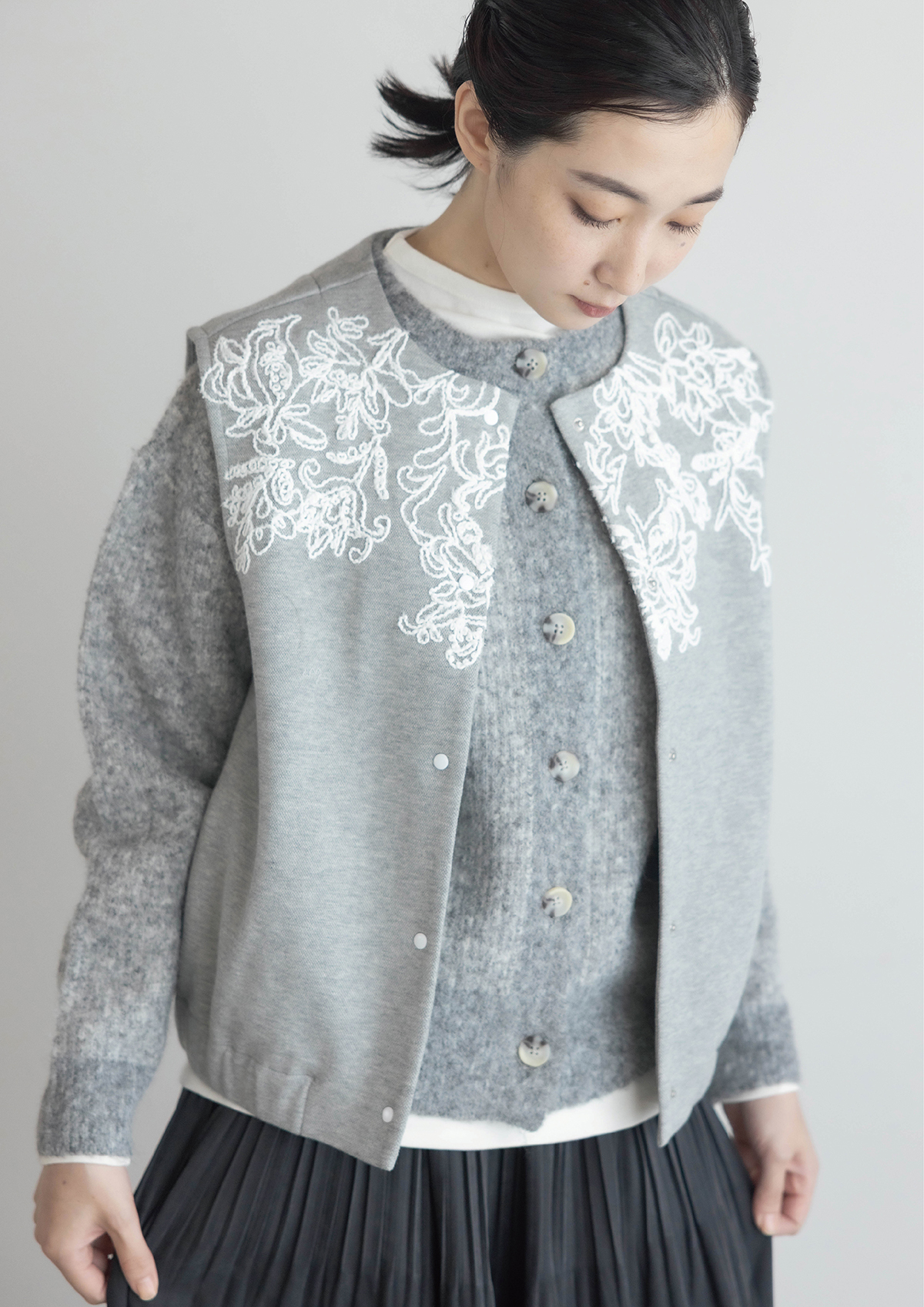 SIHE5569 エンブロイダリーカノコ裏起毛ジレ(チャコール)