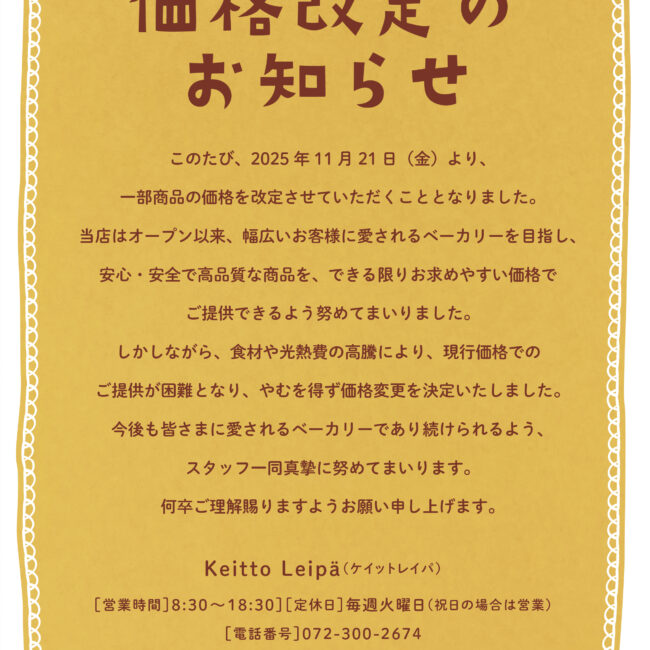 【Keitto Leipa】価格改定のお知らせ